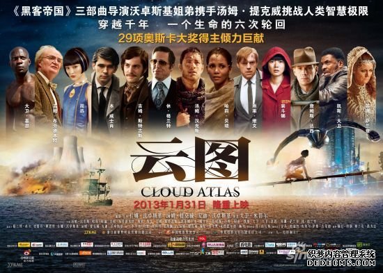 【云圖】(CloudAtlas)改編自大衛·米切爾的同名小說,故事從六個人在不同時空的際遇入手,時間跨越以公元1850年為始,一直延伸到后末日時期的未來,看似毫不相干卻又環環相扣,因而被譽為有史以來能挑戰閱讀想象力的小說。